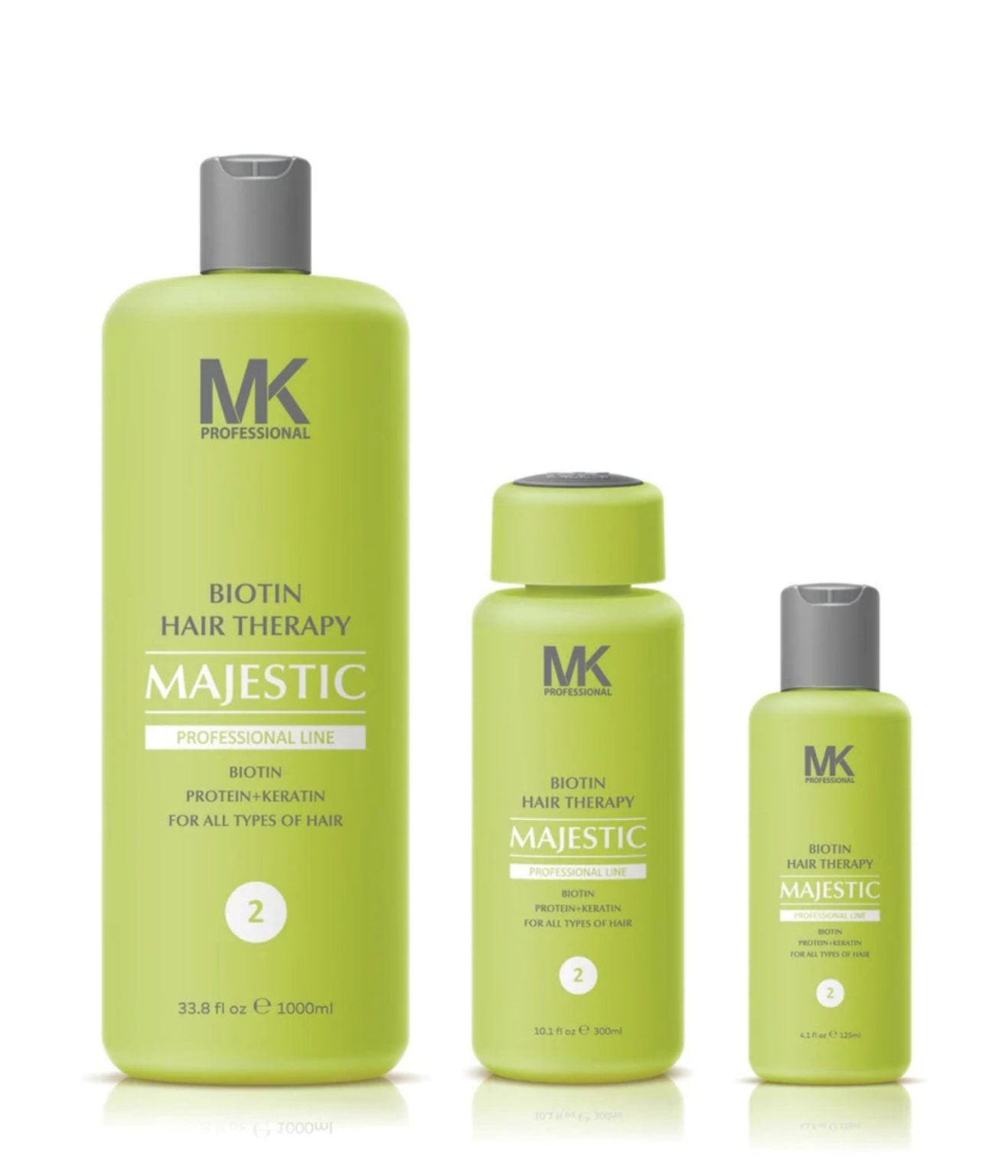 MK Majestic Biotin Hair Therapy is de krachtigste salonbehandeling uit de MK Majestic Therapy lijn, speciaal ontwikkeld om kroes, pluis en beschadigd haar te herstellen en te versterken. Deze innovatieve, natuurlijke vloeibare biotine (vitamine B7) formule dringt diep door in de haarzakjes en combineert natuurlijke eiwitten, aminozuren en collageen om het haar glad, zacht en glanzend te maken. Het resultaat is zichtbaar, voelbaar en langdurig, met herstel van de haarstructuur van binnenuit.